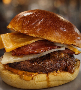 Cama de cebolla caramelizada al estilo Chiqui, con rúcula, tomate seco, y nuestra salsa especial de mayonesa trufada, con 200 grs de carne de vaca madurada, de una picada y pan Juanito Baker potato rolls.