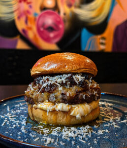 Una propuesta con alma latina: carne jugosa, queso latino y gouda fundido, plátano macho crujiente, plátano maduro caramelizado, crema de aguacate y mayonesa con cilantro. Sabores dulces, salados y frescos que te transportan al trópico en cada bocado.