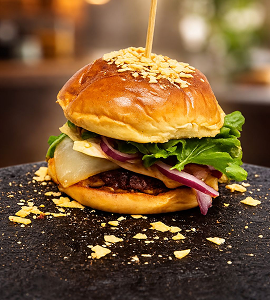 Brioche negro Juanito Baker cubierto de oro comestible, carne de chuleta de vaca madurada 40 días, queso ahumado, salsa queso cheddar ahumado, salsa emmy, mermelada de bacon, costillar deshilachado, enoa bbq temperature al bourbon, sour cream y bacon bits crujiente